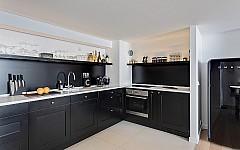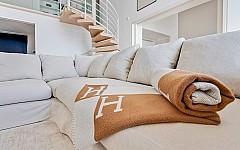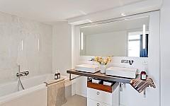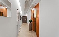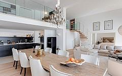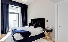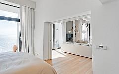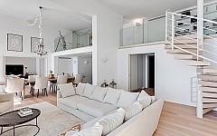 The apartment includes 2 spacious bedrooms featured with 2 en-suite bathrooms, a fully-equipped open space kitchen, delightful sea-view dining and living area continuing to elegant arch shape terraces, one of which is furnished with 2 classy comfortable armchairs and table, another one with sun bed so you can enjoy your day with spectacular views of the French Riviera coast. On the second floor there is a dressing room, a work studio with library and a laundry. The interior was created by Ralph Laurent interior designers. The apartment also includes a double garage, two parking spaces and a cellar.